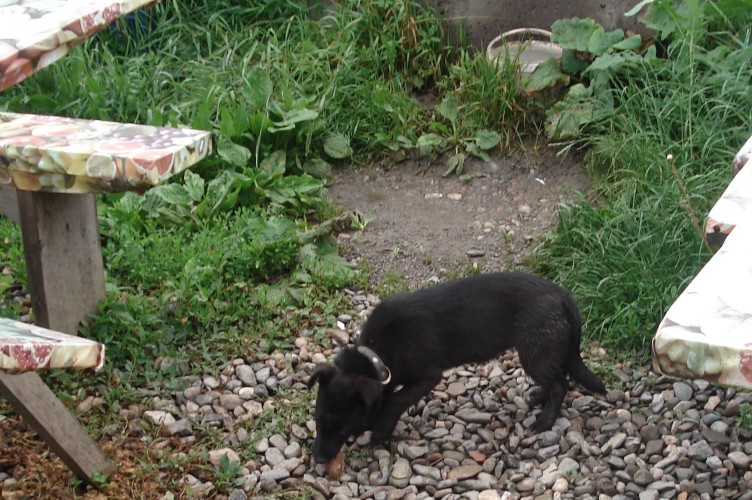Das ist Alfi. Sie gehört auch einer Frau in dem Dorf und hatte sich von der Kette gerissen. Sie lief dem Auto hinterher und wir schauten nach. Arme Alfi, die Kette war so eng am Hals, daß mein kleiner Finger nicht mehr zwischendurch passte. Verschlossen war sie mit einem Stück Draht, dessen Enden nach oben weg standen. Er ließ sich nicht aufdrehen, da half jetzt nur noch ein Bolzenschneider. Ziemlich wütend kam die Besitzerin angerannt, aber nach einer ordentlichen Moralpredigt von Vera darf Alfi jetzt ohne Kette sein.