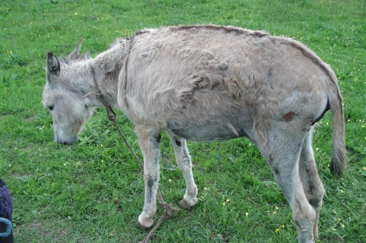 Juni 2013: Die Leute hatten sie einfach auf der Wiese stehen lassen, sie kam nachts nicht in den Stall, bekam außer dem Gras um sie herum nichts zu fressen. Sie war nicht gestriegelt, die Hufe waren viel zu lang und sehr verschmutzt. Silvia konnte inzwischen kaum noch aufstehen, man mußte ihr helfen und sie hatte auch schon eine Wunde vom Liegen. Armes altes Eselchen...